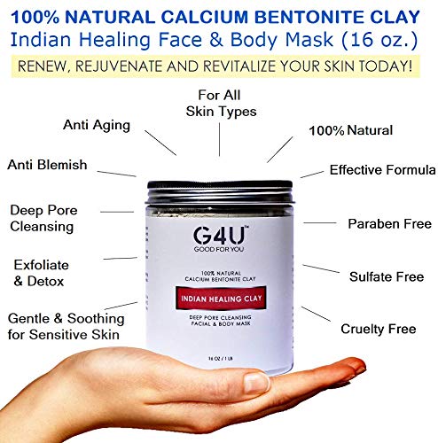- 100% NATURAL CALCIUM BENTONITE: The G4U Indian Healing Clay mask contains 100% natural calcium bentonite clay. It is ideal for facial and body mask. Our clay face mask is free from additives, harsh chemicals, artificial ingredients, dyes, parabens, sulfates or animal products.