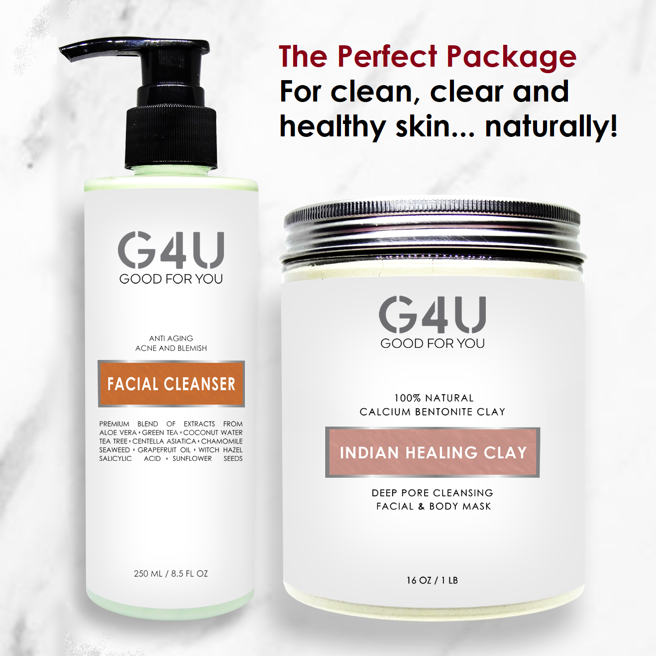 The G4U FACE & BODY HOLIDAY PACKAGE GIFT SET includes the G4U Facial Cleanser (1 Qty) and G4U Face & Body Mask (1 Qty).