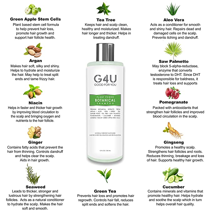 G4U Botanical Shampoo is packed with plant based natural ingredients for hair recovery, rejuvenation and revitalization. The shampoo contains natural hair boosting ingredients including aloe vera juice, green tea extract, cucumber fruit extract, pomegranate extract, malus domestica green apple stem cells and ginger root extract for healthy hair.